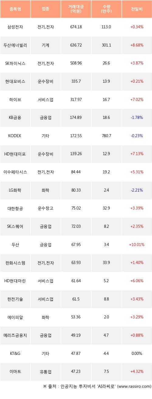 삼성전자, 두산에너빌리티, SK하이닉스 등은 전일 대비 주가가 상승했고, KB금융, KODEX 200선물인버스2X, LG화학 등은 주가가 하락했다.