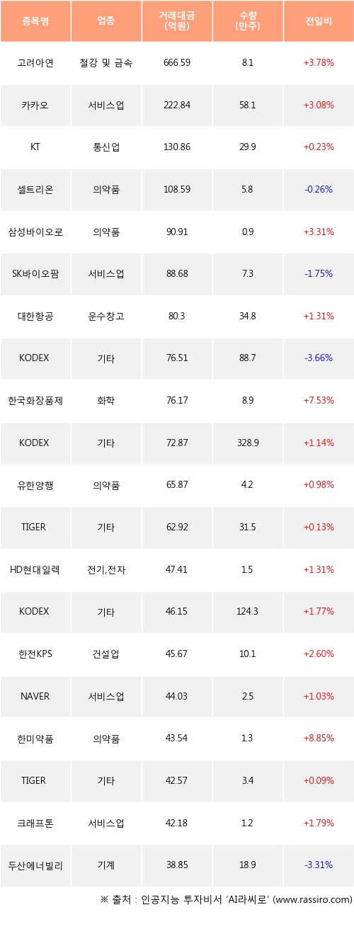 고려아연, 카카오, KT 등은 전일 대비 주가가 상승했고, 셀트리온, SK바이오팜, KODEX 코스닥150레버리지 등은 주가가 하락했다.
