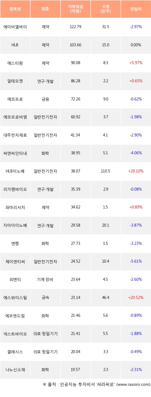 에스티팜, 알테오젠, HLB이노베이션 등은 전일 대비 주가가 상승했고, 에이비엘바이오, 에코프로, 에코프로비엠 등은 주가가 하락했다.