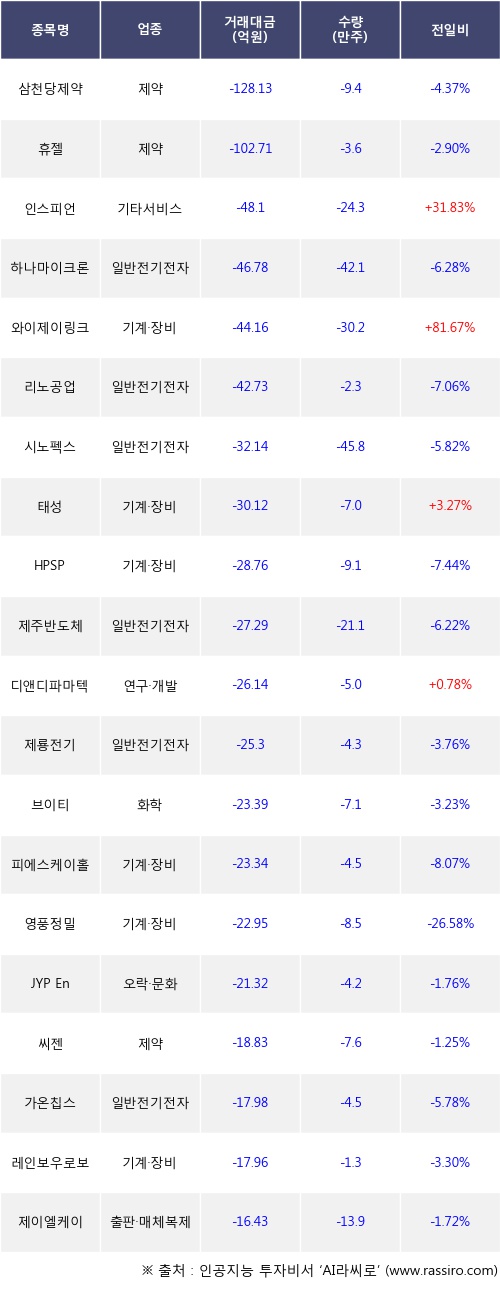 외국인 투자자의 순매도 상위 20개 종목은 삼천당제약, 휴젤, 인스피언, 하나마이크론, 와이제이링크, 리노공업, 시노펙스, 태성, HPSP, 제주반도체등이다.