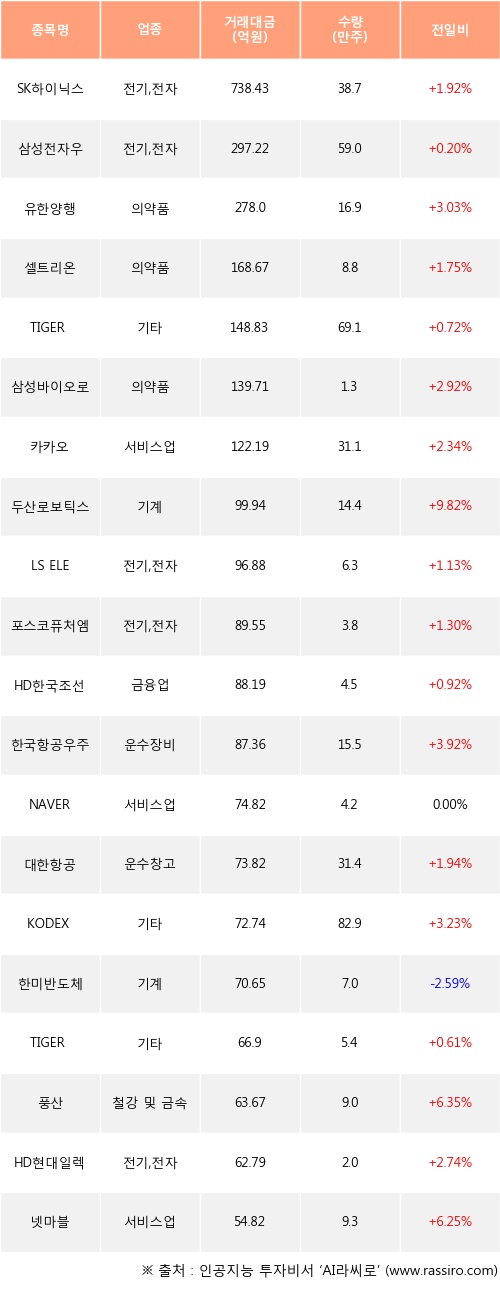 SK하이닉스, 삼성전자우, 유한양행 등은 전일 대비 주가가 상승했고, 한미반도체 등은 주가가 하락했다.