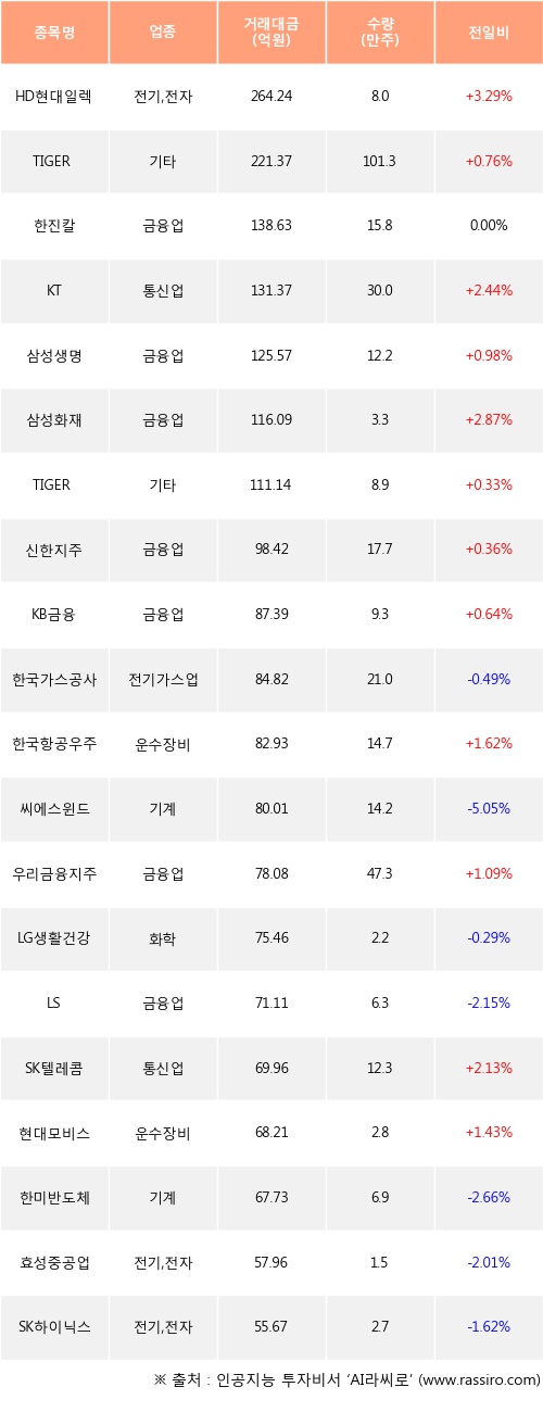 HD현대일렉트릭, TIGER 미국테크TOP10 INDXX, KT 등은 전일 대비 주가가 상승했고, 한국가스공사, 씨에스윈드, LG생활건강 등은 주가가 하락했다.