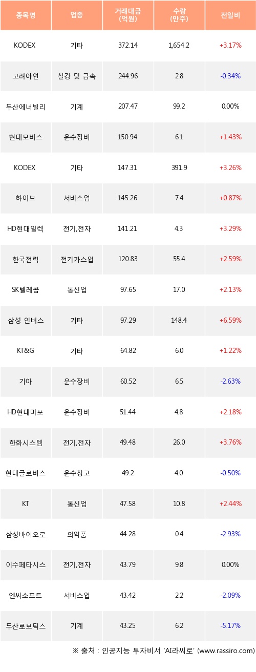 KODEX 200선물인버스2X, 현대모비스, KODEX 코스닥150선물인버스 등은 전일 대비 주가가 상승했고, 고려아연, 기아, 현대글로비스 등은 주가가 하락했다.