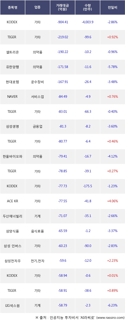 기관 투자자의 순매도 상위 20개 종목은 KODEX 200선물인버스2X, TIGER 미국테크TOP10 INDXX, 셀트리온, 유한양행, 현대로템, NAVER, TIGER 미국배당다우존스, 삼성생명, TIGER 미국나스닥100, 한올바이오파마등이다.