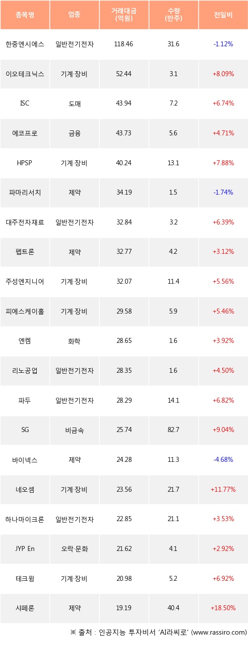 외국인 투자자의 순매수 상위 20개 종목은 한중엔시에스, 이오테크닉스, ISC, 에코프로, HPSP, 파마리서치, 대주전자재료, 펩트론, 주성엔지니어링, 피에스케이홀딩스등이다.