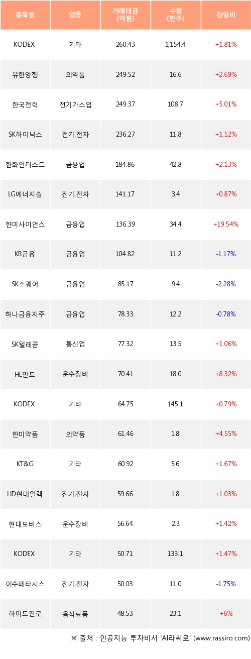 KODEX 200선물인버스2X, 유한양행, 한국전력 등은 전일 대비 주가가 상승했고, KB금융, SK스퀘어, 하나금융지주 등은 주가가 하락했다.