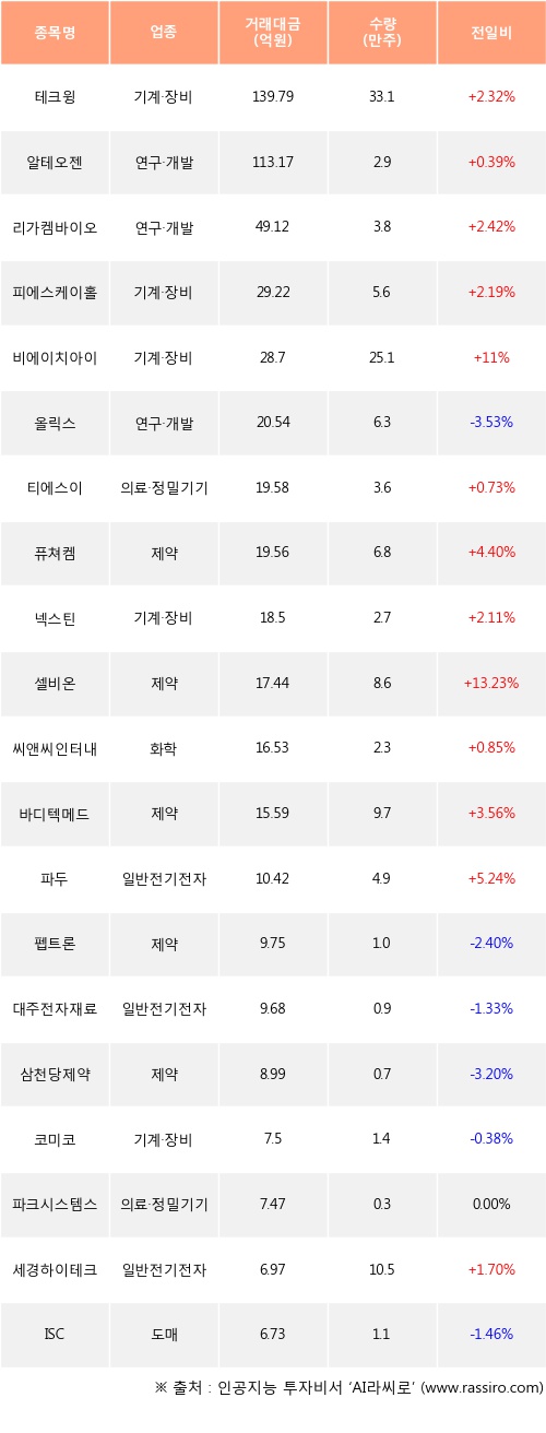 테크윙, 알테오젠, 리가켐바이오 등은 전일 대비 주가가 상승했고, 올릭스, 펩트론, 대주전자재료 등은 주가가 하락했다.