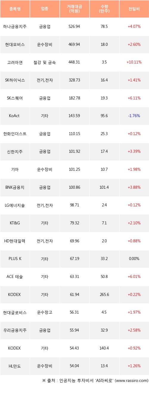 하나금융지주, 현대모비스, 고려아연 등은 전일 대비 주가가 상승했고, KoAct 바이오헬스케어액티브 등은 주가가 하락했다.