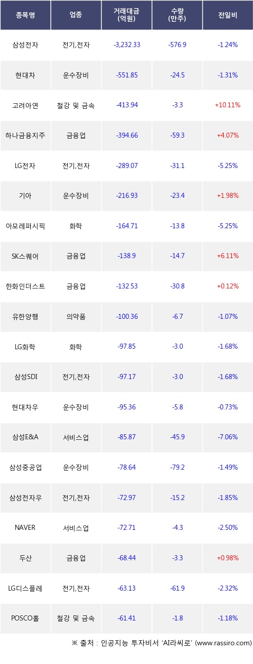 외국인 투자자의 순매도 상위 20개 종목은 삼성전자, 현대차, 고려아연, 하나금융지주, LG전자, 기아, 아모레퍼시픽, SK스퀘어, 한화인더스트리얼솔루션즈, 유한양행등이다.
