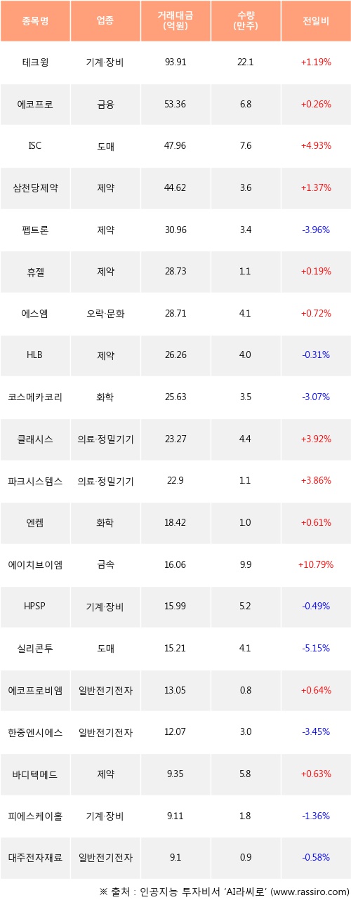 기관 투자자의 순매수 상위 20개 종목은 테크윙, 에코프로, ISC, 삼천당제약, 펩트론, 휴젤, 에스엠, HLB, 코스메카코리아, 클래시스등이다.