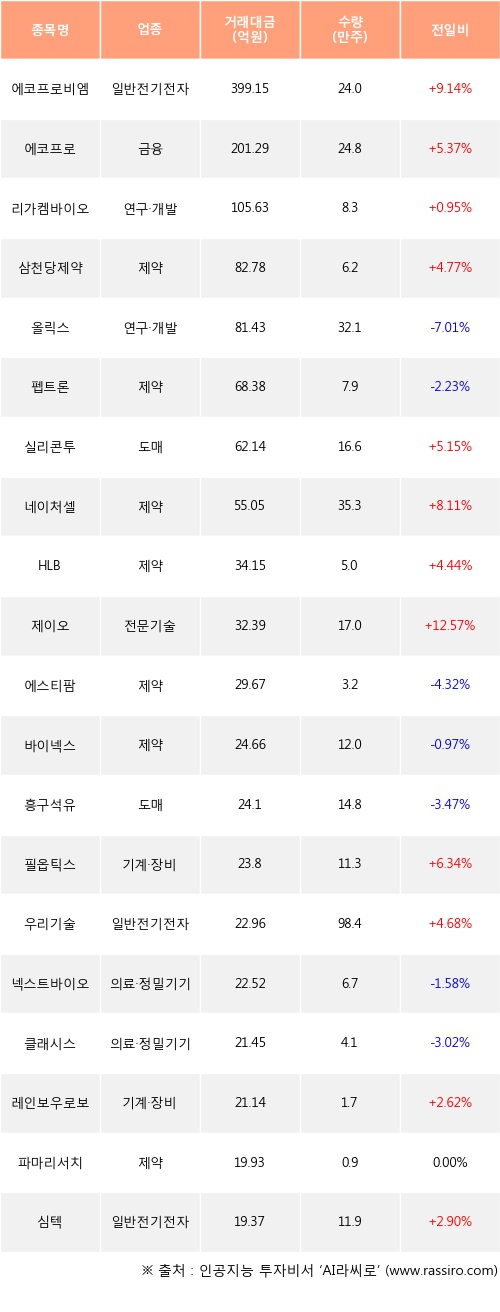 에코프로비엠, 에코프로, 리가켐바이오 등은 전일 대비 주가가 상승했고, 올릭스, 펩트론, 에스티팜 등은 주가가 하락했다.