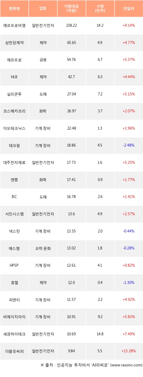 에코프로비엠, 삼천당제약, 에코프로 등은 전일 대비 주가가 상승했고, 테크윙, 넥스틴, 에스엠 등은 주가가 하락했다.