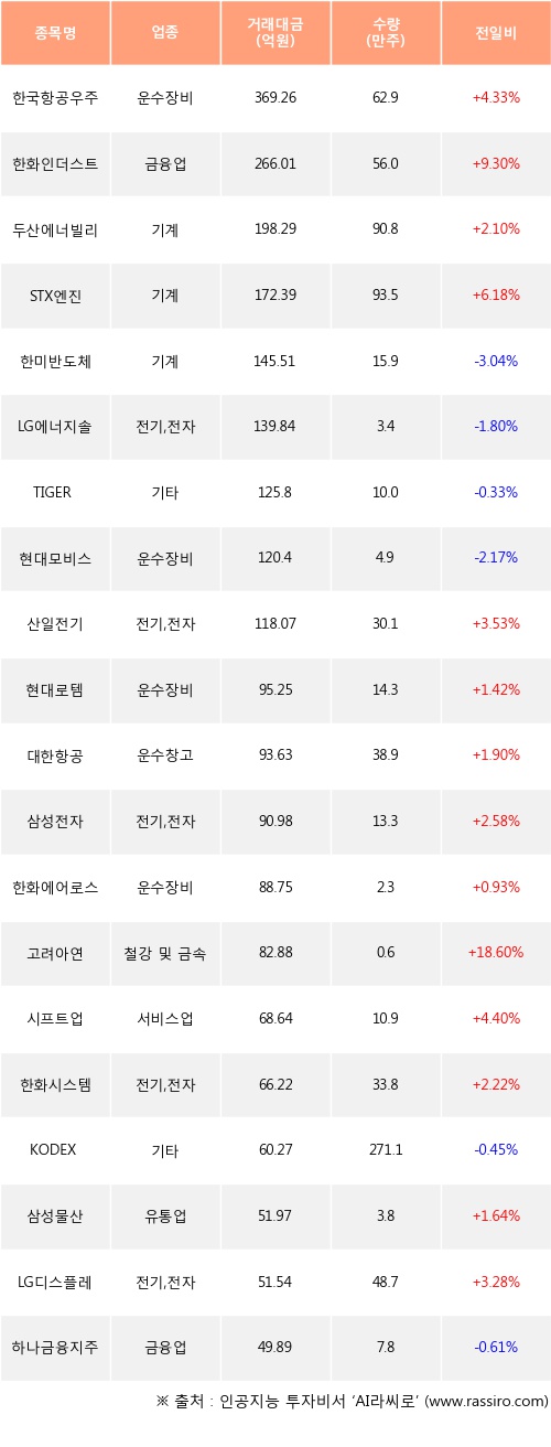 한국항공우주, 한화인더스트리얼솔루션즈, 두산에너빌리티 등은 전일 대비 주가가 상승했고, 한미반도체, LG에너지솔루션, TIGER 미국나스닥100 등은 주가가 하락했다.