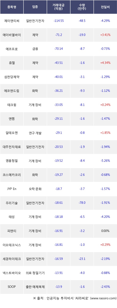 외국인 투자자의 순매도 상위 20개 종목은 제이앤티씨, 에이비엘바이오, 에코프로, 휴젤, 삼천당제약, 에코앤드림, 테크윙, 엔켐, 알테오젠, 대주전자재료등이다.
