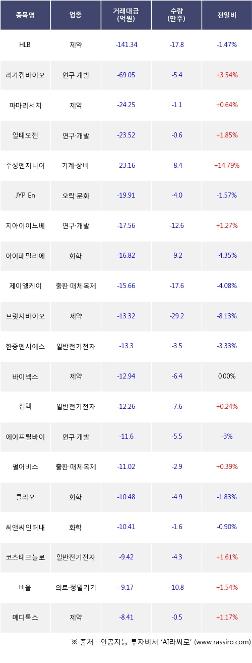 기관 투자자의 순매도 상위 20개 종목은 HLB, 리가켐바이오, 파마리서치, 알테오젠, 주성엔지니어링, JYP Ent., 지아이이노베이션, 아이패밀리에스씨, 제이엘케이, 브릿지바이오테라퓨틱스등이다.