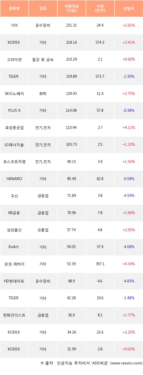 기아, KODEX 코스닥150선물인버스, 고려아연 등은 전일 대비 주가가 상승했고, TIGER 화장품, PLUS K방산, HANARO CAPEX설비투자iSelect 등은 주가가 하락했다.