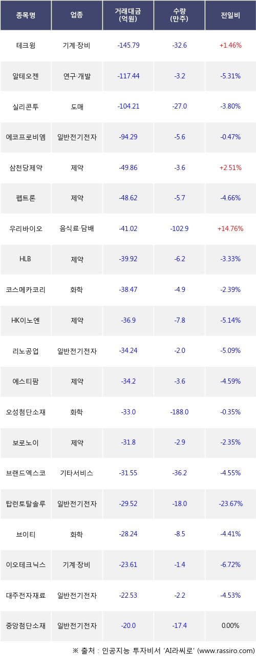 외국인 투자자의 순매도 상위 20개 종목은 테크윙, 알테오젠, 실리콘투, 에코프로비엠, 삼천당제약, 펩트론, 우리바이오, HLB, 코스메카코리아, HK이노엔등이다.
