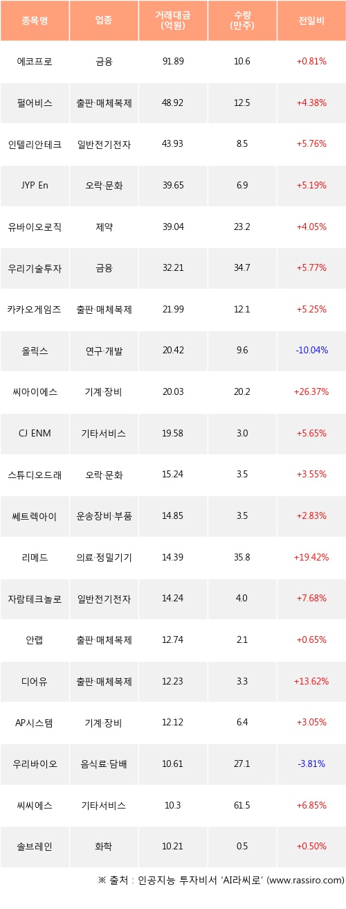에코프로, 펄어비스, 인텔리안테크 등은 전일 대비 주가가 상승했고, 올릭스, 우리바이오 등은 주가가 하락했다.