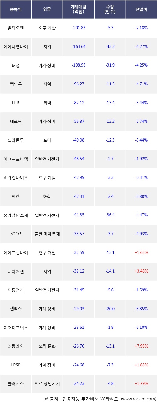 외국인 투자자의 순매도 상위 20개 종목은 알테오젠, 에이비엘바이오, 태성, 펩트론, HLB, 테크윙, 실리콘투, 에코프로비엠, 리가켐바이오, 엔켐등이다.