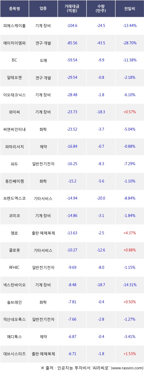 기관 투자자의 순매도 상위 20개 종목은 피에스케이홀딩스, 에이치이엠파마, ISC, 알테오젠, 이오테크닉스, 와이씨, 씨앤씨인터내셔널, 파마리서치, 파두, 동진쎄미켐등이다.