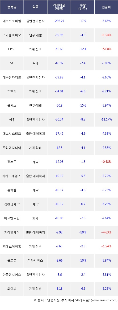 기관 투자자의 순매도 상위 20개 종목은 에코프로비엠, 리가켐바이오, HPSP, ISC, 대주전자재료, 피엔티, 올릭스, 성우, 데브시스터즈, 주성엔지니어링등이다.