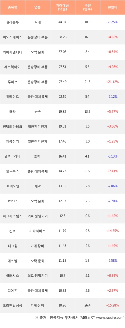 기관 투자자의 순매수 상위 20개 종목은 실리콘투, 이노스페이스, 와이지엔터테인먼트, 쎄트렉아이, 루미르, 위메이드, 태광, 인텔리안테크, 제룡전기, 펌텍코리아등이다.