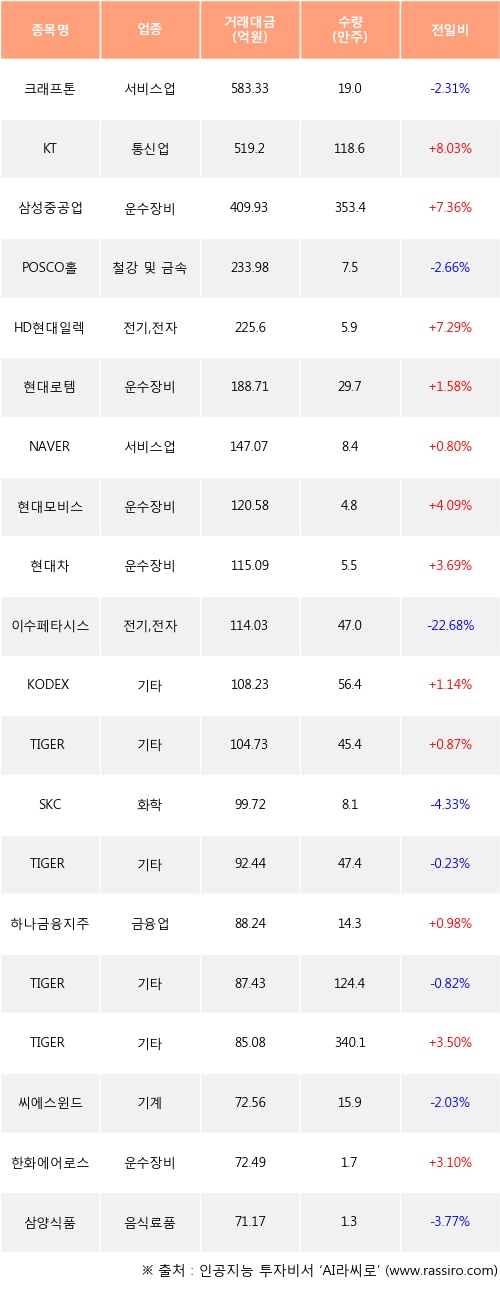 KT, 삼성중공업, HD현대일렉트릭 등은 전일 대비 주가가 상승했고, 크래프톤, POSCO홀딩스, 이수페타시스 등은 주가가 하락했다.