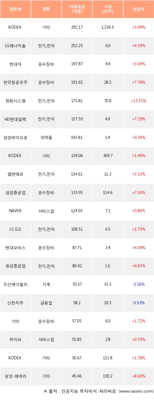 기관 투자자의 순매수 상위 20개 종목은 KODEX 200선물인버스2X, LG에너지솔루션, 현대차, 한국항공우주, 한화시스템, HD현대일렉트릭, 삼성바이오로직스, KODEX 코스닥150선물인버스, 엘앤에프, 삼성중공업등이다.