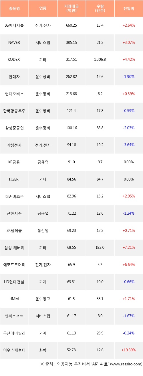 LG에너지솔루션, NAVER, KODEX 200선물인버스2X 등은 전일 대비 주가가 상승했고, 현대차, 한국항공우주, 삼성중공업 등은 주가가 하락했다.
