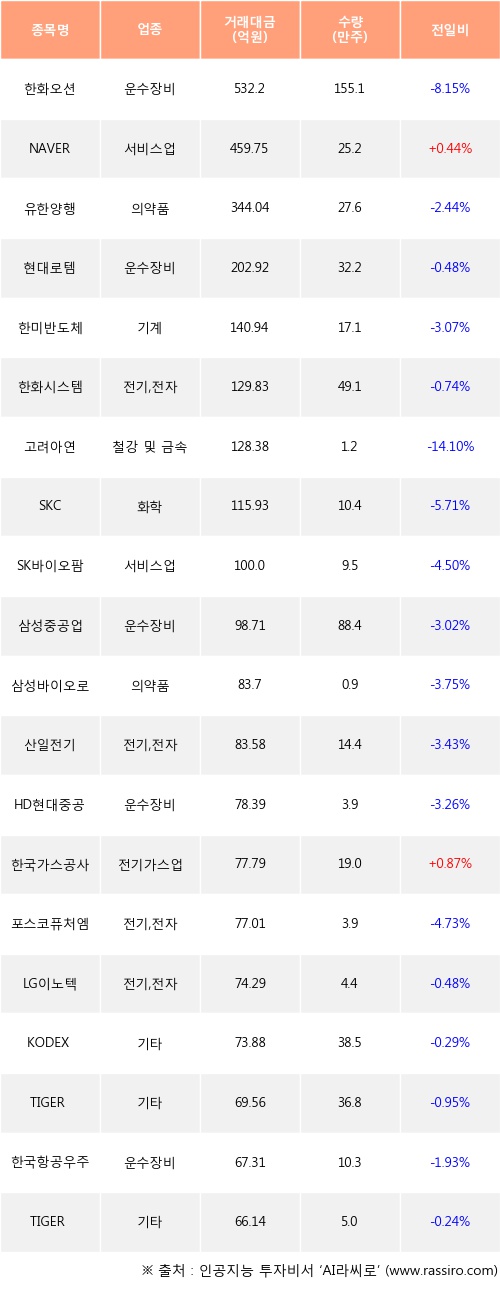 외국인 투자자의 순매수 상위 20개 종목은 한화오션, NAVER, 유한양행, 현대로템, 한미반도체, 한화시스템, 고려아연, SKC, SK바이오팜, 삼성중공업등이다.