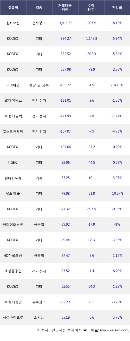 이날 기관 투자자가 순매도한 종목들 중에 한화오션, KODEX 코스닥150레버리지, KODEX 레버리지 등은 전일 대비 주가가 하락했다.