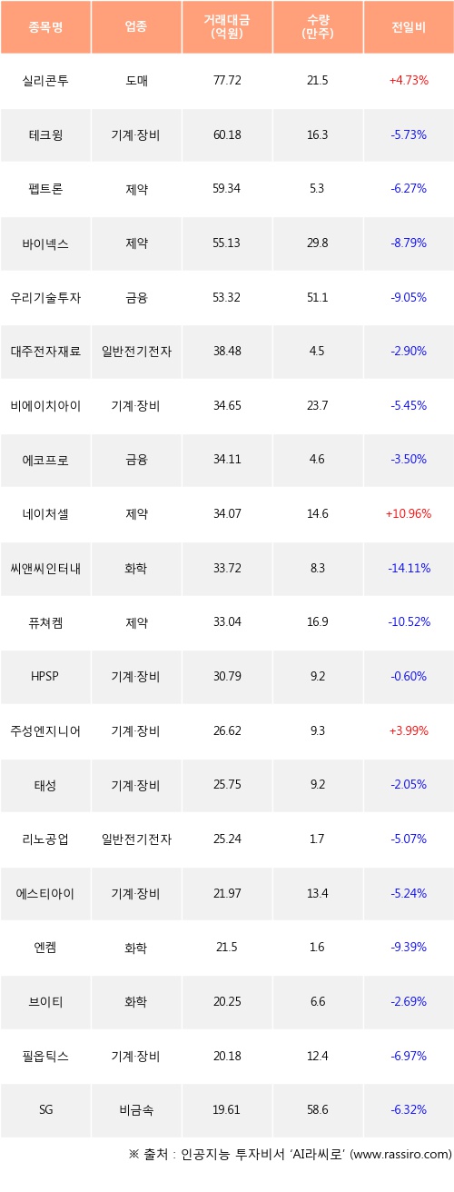 외국인 투자자의 순매수 상위 20개 종목은 실리콘투, 테크윙, 펩트론, 바이넥스, 우리기술투자, 대주전자재료, 비에이치아이, 에코프로, 네이처셀, 씨앤씨인터내셔널등이다.
