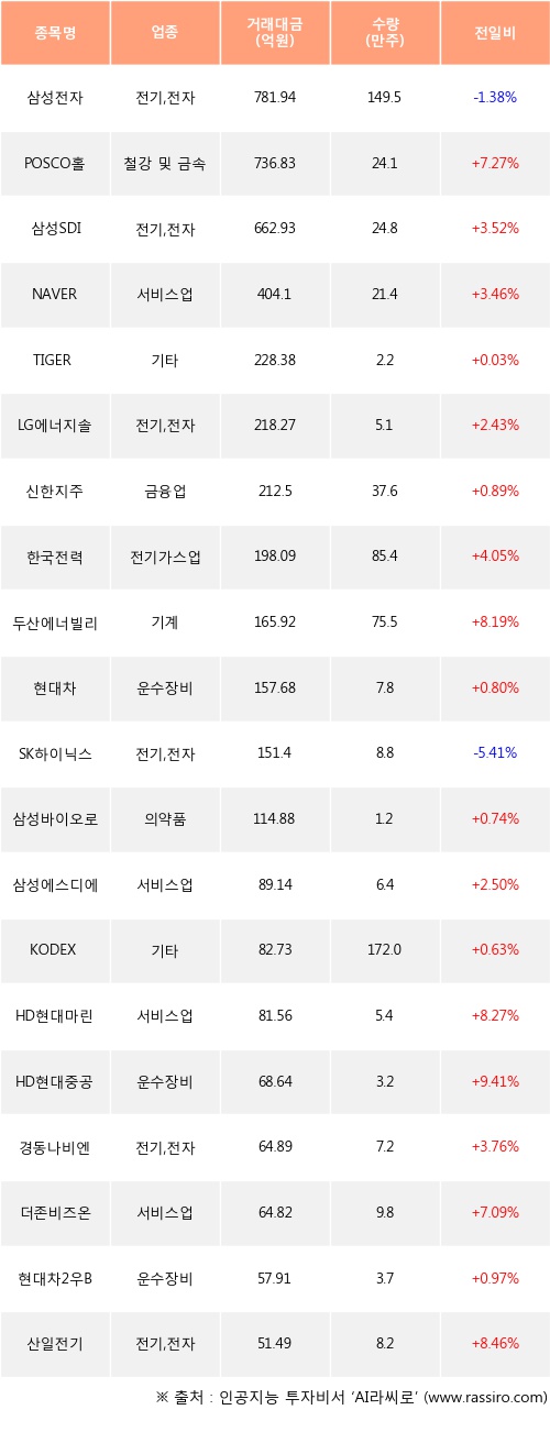 POSCO홀딩스, 삼성SDI, NAVER 등은 전일 대비 주가가 상승했고, 삼성전자, SK하이닉스 등은 주가가 하락했다.