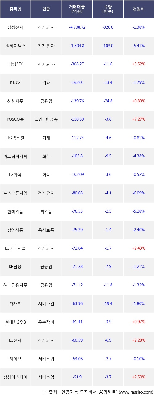 외국인 투자자의 순매도 상위 20개 종목은 삼성전자, SK하이닉스, 삼성SDI, KT&G, 신한지주, POSCO홀딩스, LIG넥스원, 아모레퍼시픽, LG화학, 포스코퓨처엠등이다.