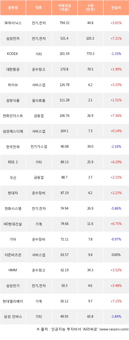 SK하이닉스, 삼성전자, 대한항공 등은 전일 대비 주가가 상승했고, KODEX 200선물인버스2X, 한국전력, 한화시스템 등은 주가가 하락했다.