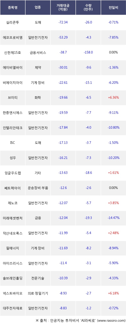 기관 투자자의 순매도 상위 20개 종목은 실리콘투, 에코프로비엠, 신한제15호스팩, 에이비엘바이오, 비에이치아이, 브이티, 한중엔시에스, 인텔리안테크, ISC, 성우등이다.