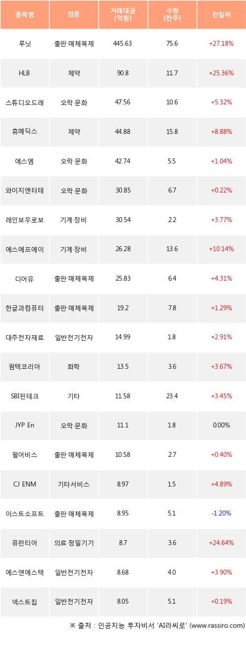 루닛, HLB, 스튜디오드래곤 등은 전일 대비 주가가 상승했고, 이스트소프트 등은 주가가 하락했다.