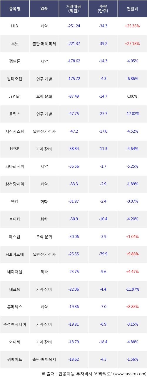 외국인 투자자의 순매도 상위 20개 종목은 HLB, 루닛, 펩트론, 알테오젠, JYP Ent., 올릭스, 서진시스템, HPSP, 파마리서치, 삼천당제약등이다.