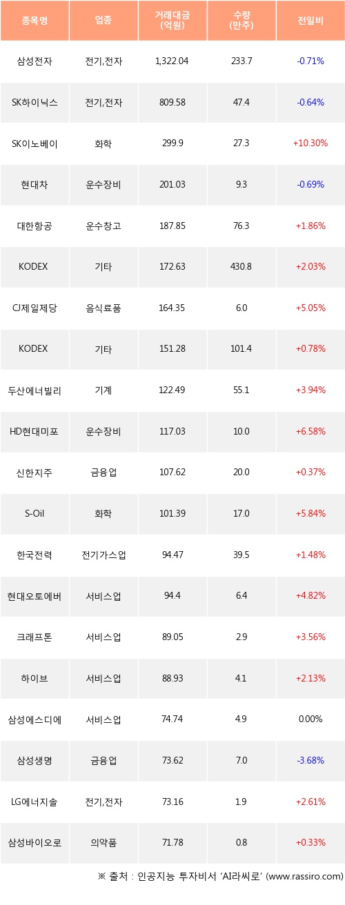 SK이노베이션, 대한항공, KODEX 코스닥150선물인버스 등은 전일 대비 주가가 상승했고, 삼성전자, SK하이닉스, 현대차 등은 주가가 하락했다.