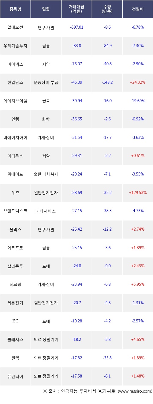 외국인 투자자의 순매도 상위 20개 종목은 알테오젠, 우리기술투자, 바이넥스, 한일단조, 에이치브이엠, 엔켐, 비에이치아이, 메디톡스, 위메이드, 위츠등이다.