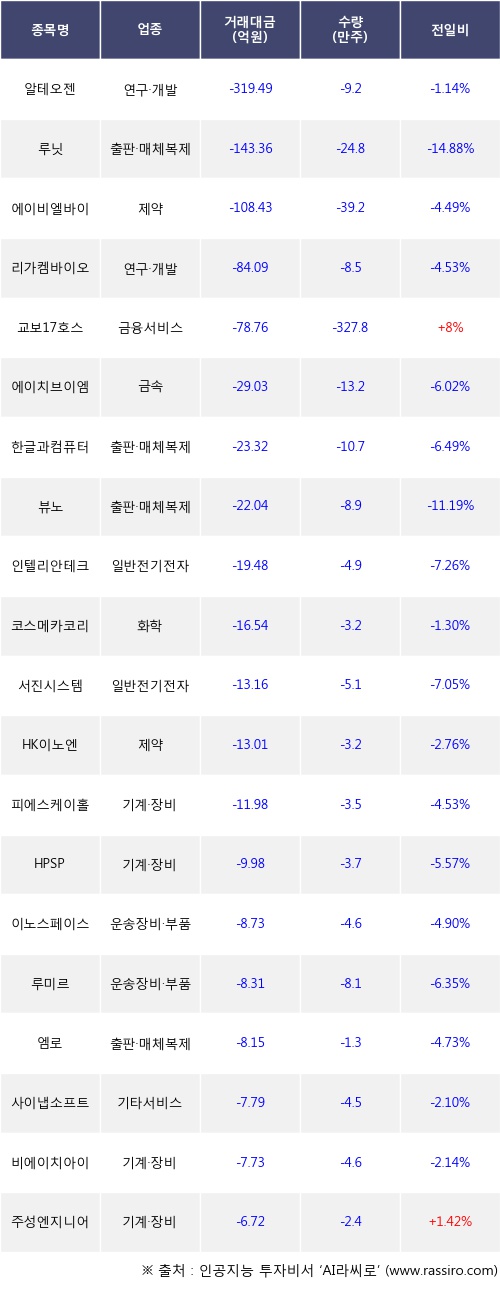 기관 투자자의 순매도 상위 20개 종목은 알테오젠, 루닛, 에이비엘바이오, 리가켐바이오, 교보17호스팩, 에이치브이엠, 한글과컴퓨터, 뷰노, 인텔리안테크, 코스메카코리아등이다.