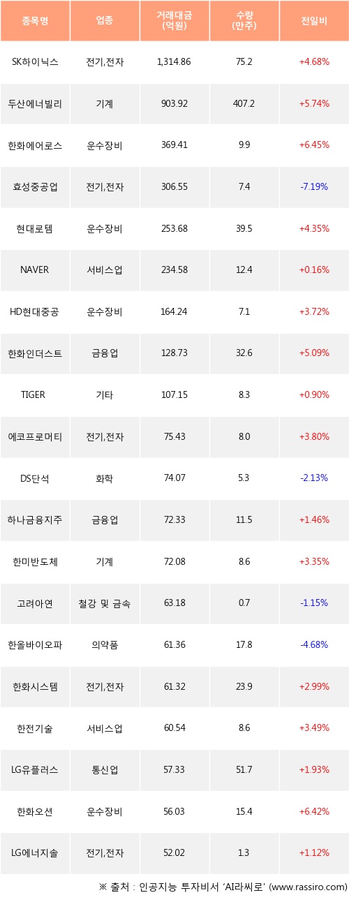 SK하이닉스, 두산에너빌리티, 한화에어로스페이스 등은 전일 대비 주가가 상승했고, 효성중공업, DS단석, 고려아연 등은 주가가 하락했다.