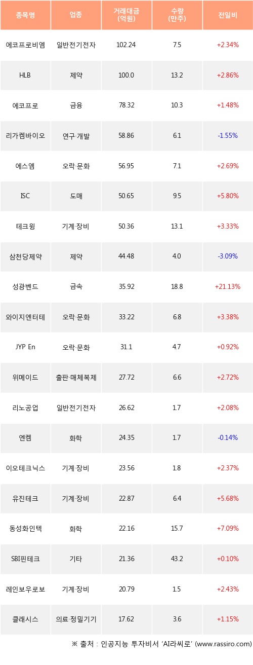 기관 투자자의 순매수 상위 20개 종목은 에코프로비엠, HLB, 에코프로, 리가켐바이오, 에스엠, ISC, 테크윙, 삼천당제약, 성광벤드, 와이지엔터테인먼트등이다.