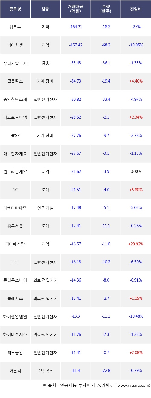 외국인 투자자의 순매도 상위 20개 종목은 펩트론, 네이처셀, 우리기술투자, 필옵틱스, 중앙첨단소재, 에코프로비엠, HPSP, 대주전자재료, 셀트리온제약, ISC등이다.