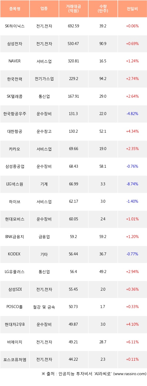 SK하이닉스, 삼성전자, NAVER 등은 전일 대비 주가가 상승했고, 한국항공우주, 삼성중공업, LIG넥스원 등은 주가가 하락했다.