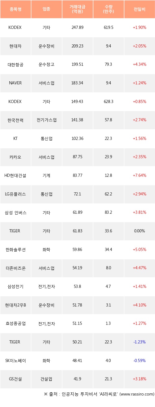 KODEX 코스닥150선물인버스, 현대차, 대한항공 등은 전일 대비 주가가 상승했고, TIGER 미국테크TOP10 INDXX, SK이노베이션 등은 주가가 하락했다.