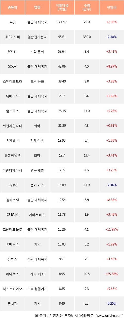 루닛, JYP Ent., SOOP 등은 전일 대비 주가가 상승했고, HLB이노베이션, 코엔텍, 퓨쳐켐 등은 주가가 하락했다.