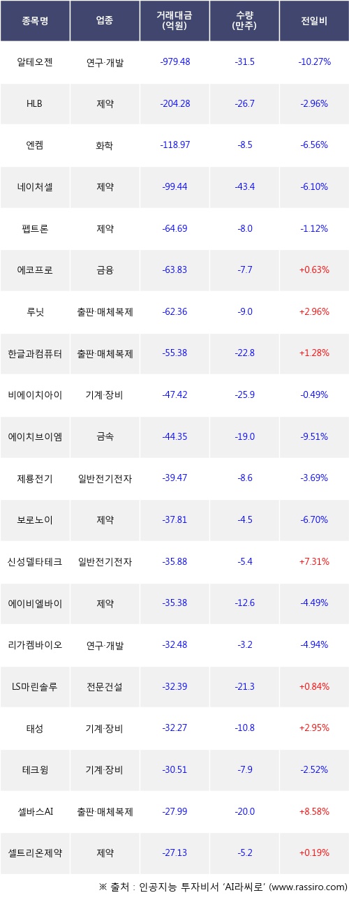 외국인 투자자의 순매도 상위 20개 종목은 알테오젠, HLB, 엔켐, 네이처셀, 펩트론, 에코프로, 루닛, 한글과컴퓨터, 비에이치아이, 에이치브이엠등이다.