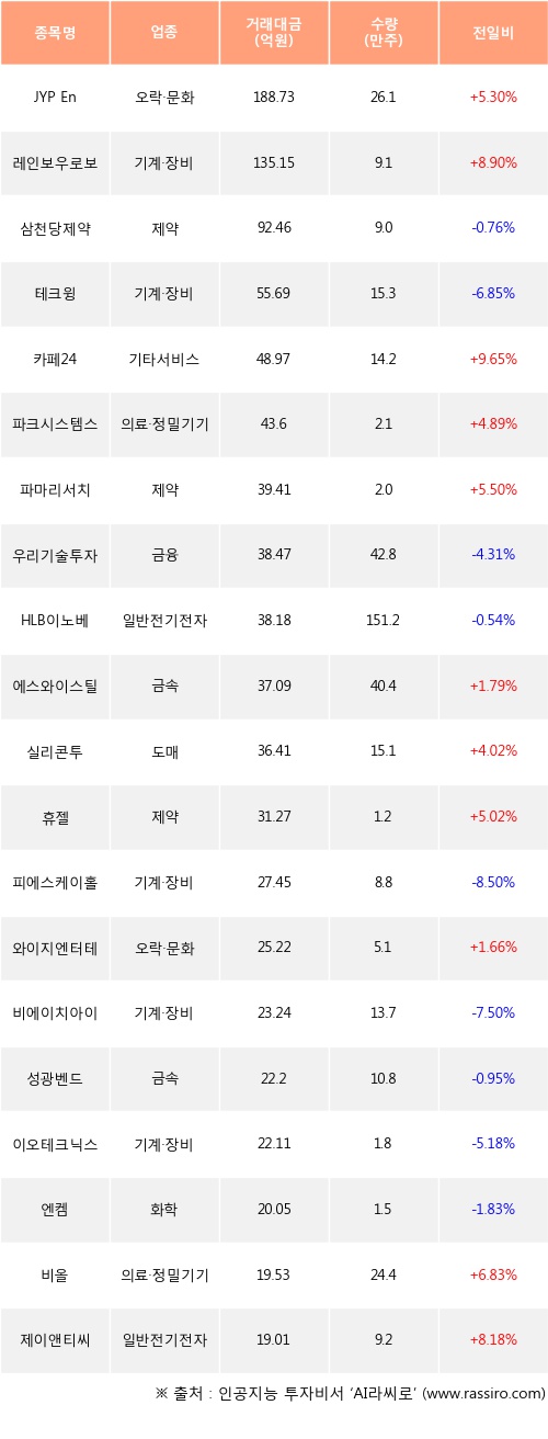JYP Ent., 레인보우로보틱스, 카페24 등은 전일 대비 주가가 상승했고, 삼천당제약, 테크윙, 우리기술투자 등은 주가가 하락했다.