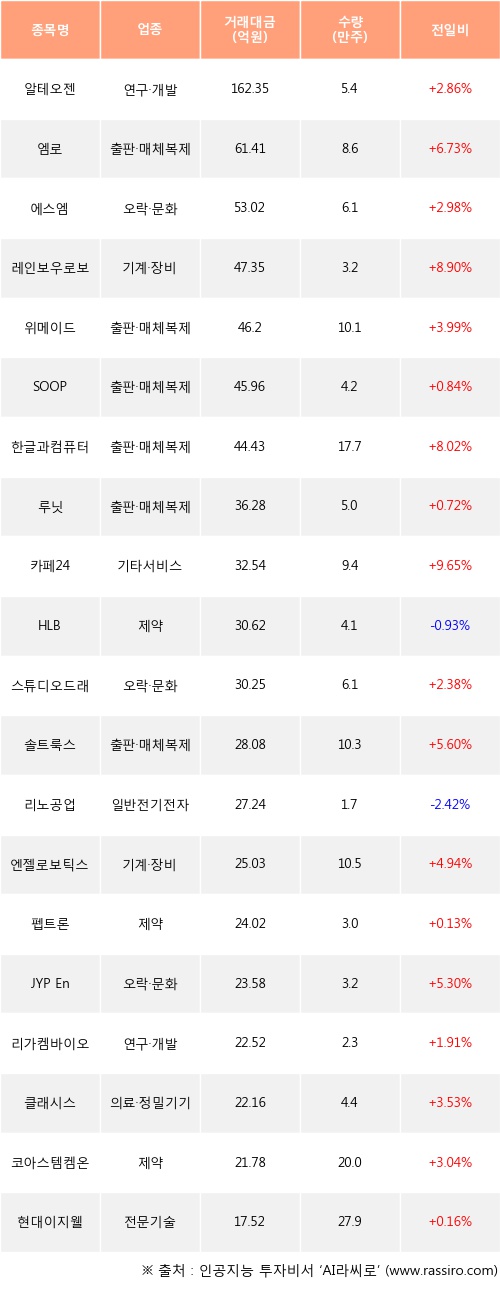 기관 투자자의 순매수 상위 20개 종목은 알테오젠, 엠로, 에스엠, 레인보우로보틱스, 위메이드, SOOP, 한글과컴퓨터, 루닛, 카페24, HLB등이다.